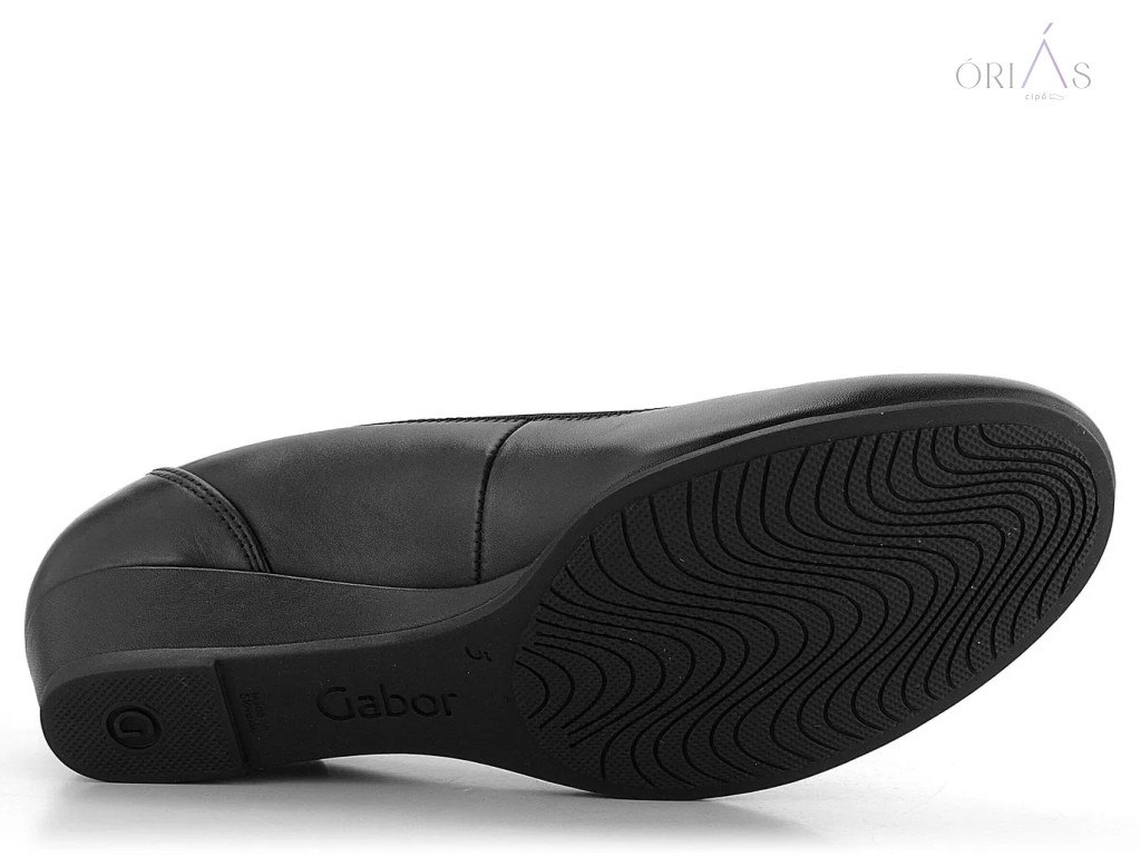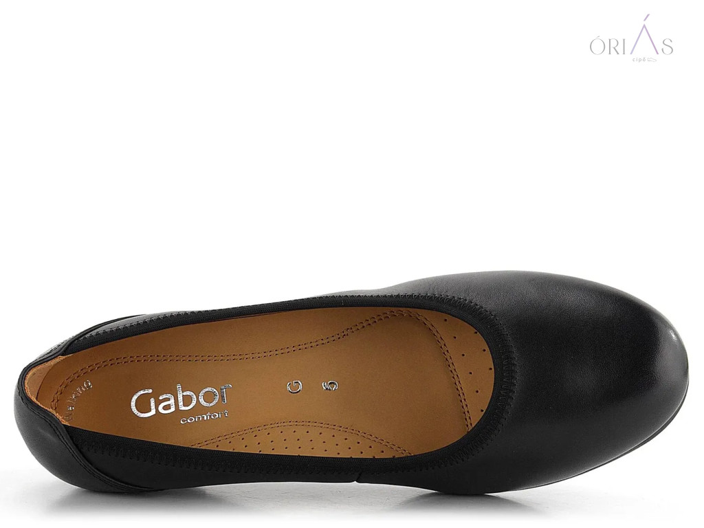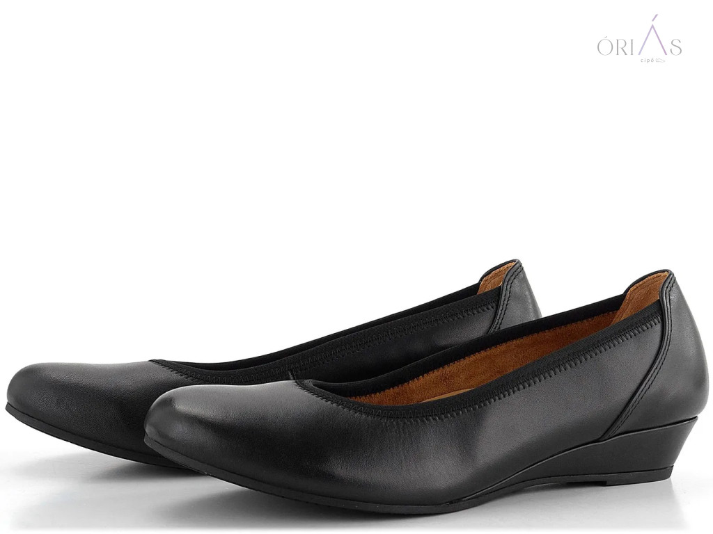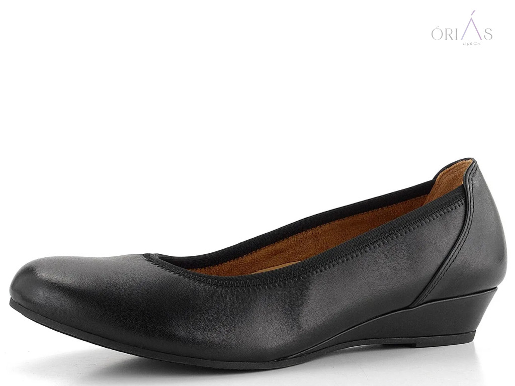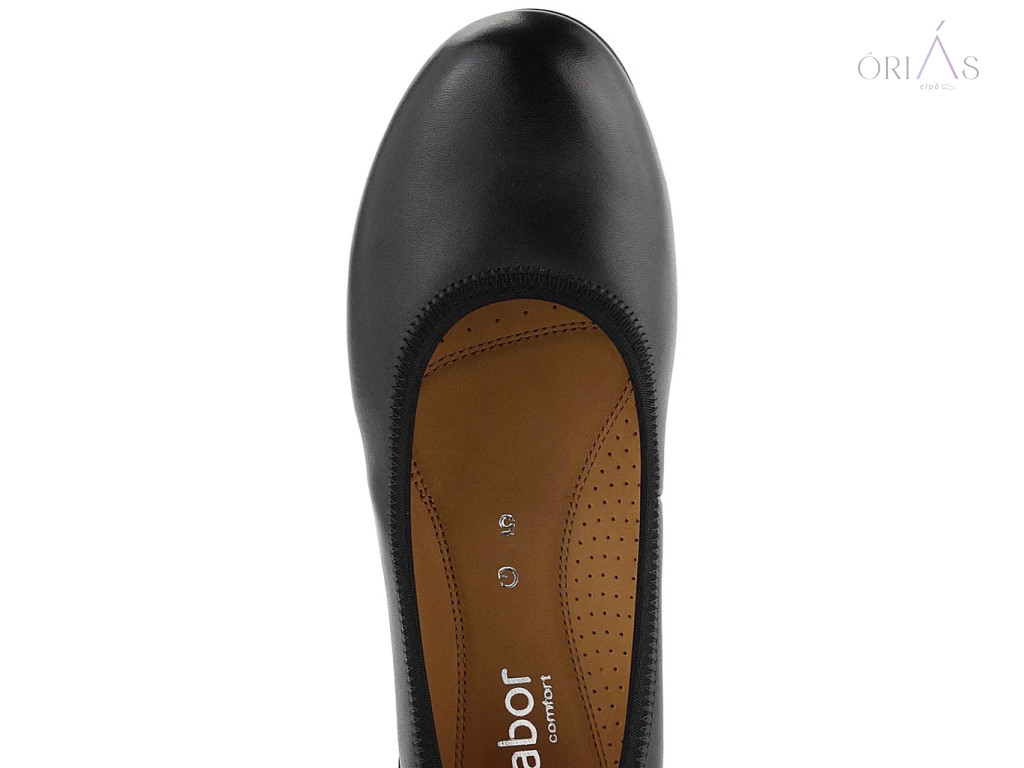 A Gabor 02.690.57 ideális, kényelmes és elegáns női balerina mindennapi használatra. Puha fekete bőrből készült és rugalmas kialakítása miatt tökéletesen illeszkedik a lábra. A 3 cm-es sarok stílust és komfortot egyaránt biztosít, a széles (G) méret pedig extra kényelmet nyújt.