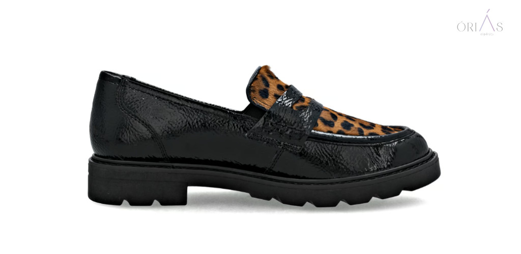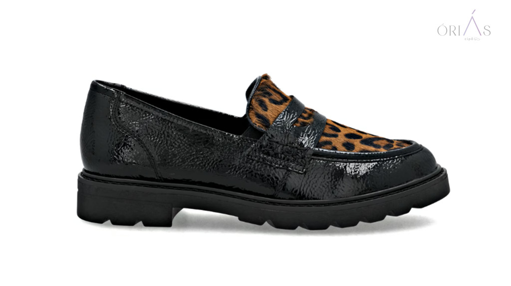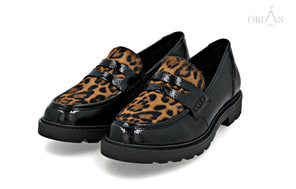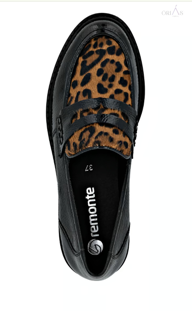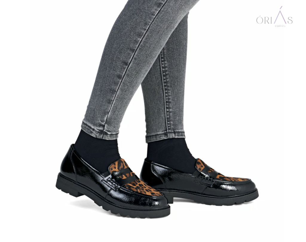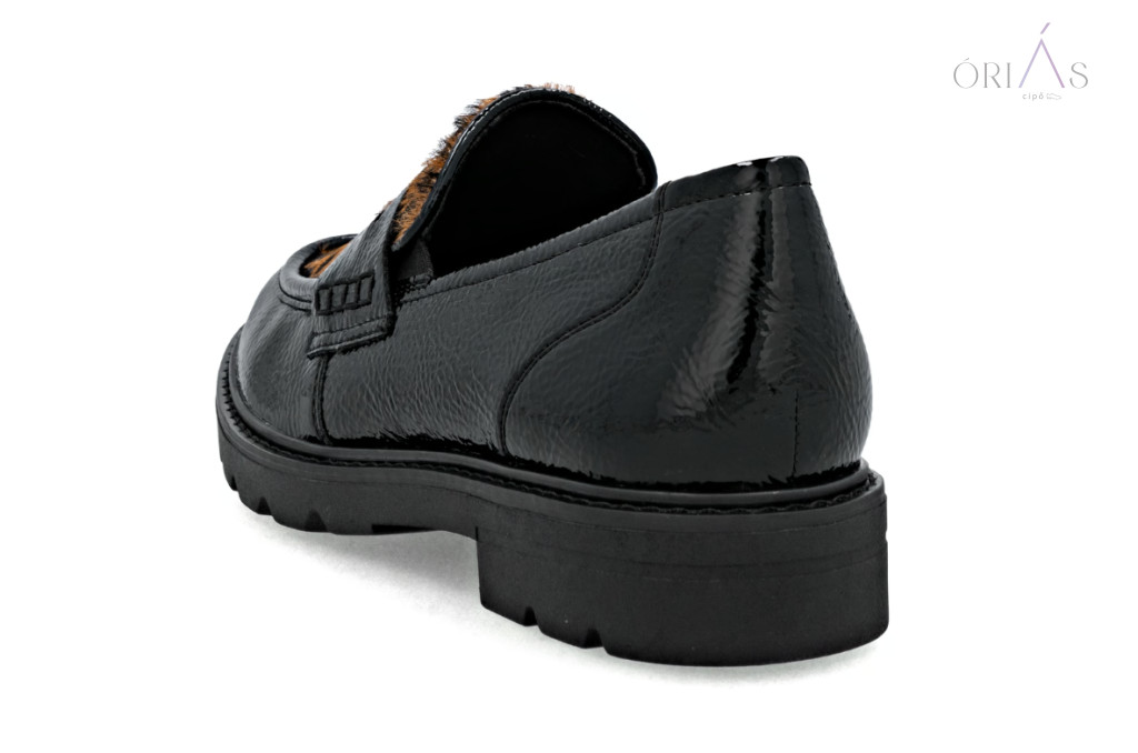 Márka: RemonteTípus: női loaferSzín: fekete-barna, leopárdmintás részlettelAnyag: műlak, bőr és textil kombinációBélés: bőr és mikroszál (légáteresztő)Talpbetét: puha, kivehetőTalp: ultra könnyű és rugalmas (Lite ’n Soft technológia)Sarok: blokk sarok, 32 mmZáródás: gumibetétes, könnyű fel- és levételSzélesség: normál (F–F ½)