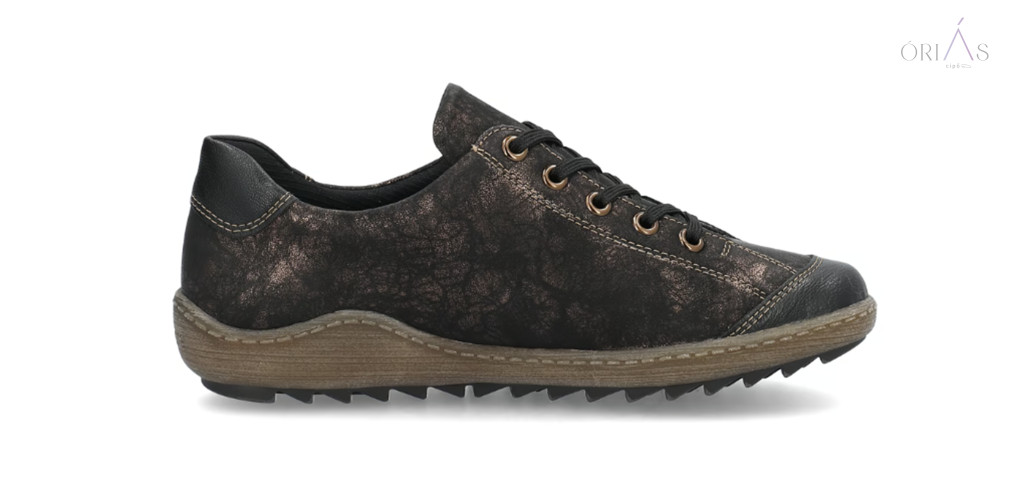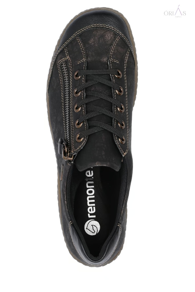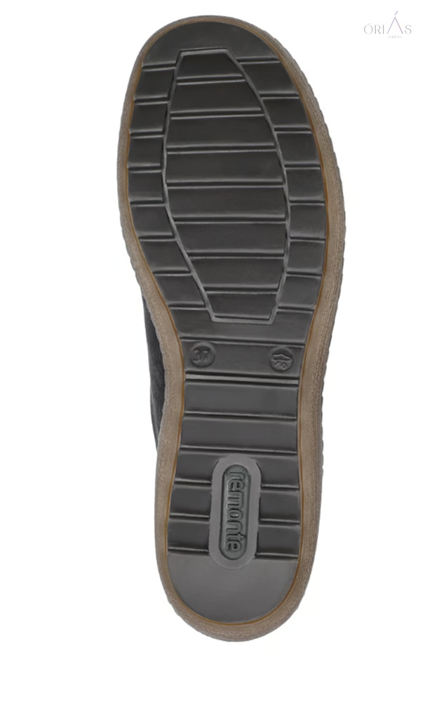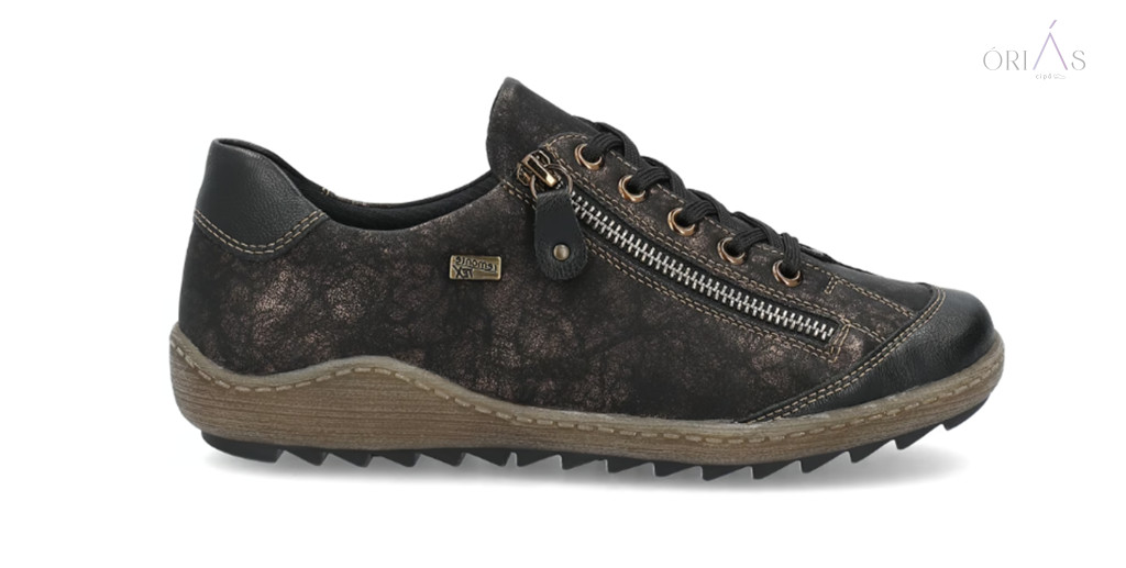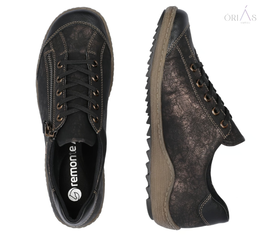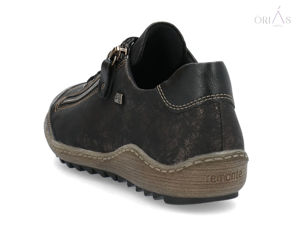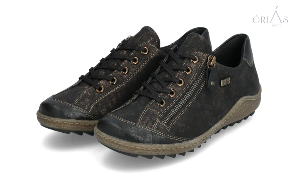 Márka: RemonteTípus: női fűzős cipőAnyag: műbőr (vízlepergető, remonteTEX membrán)Bélés: textil (Drysport membrán)Talpbetét: puha, kivehető, nyomáscsillapítóTalp: TR, rugalmas és csúszásmentesZáródás: fűző + cipzárSzélesség: komfort (G–G ½)